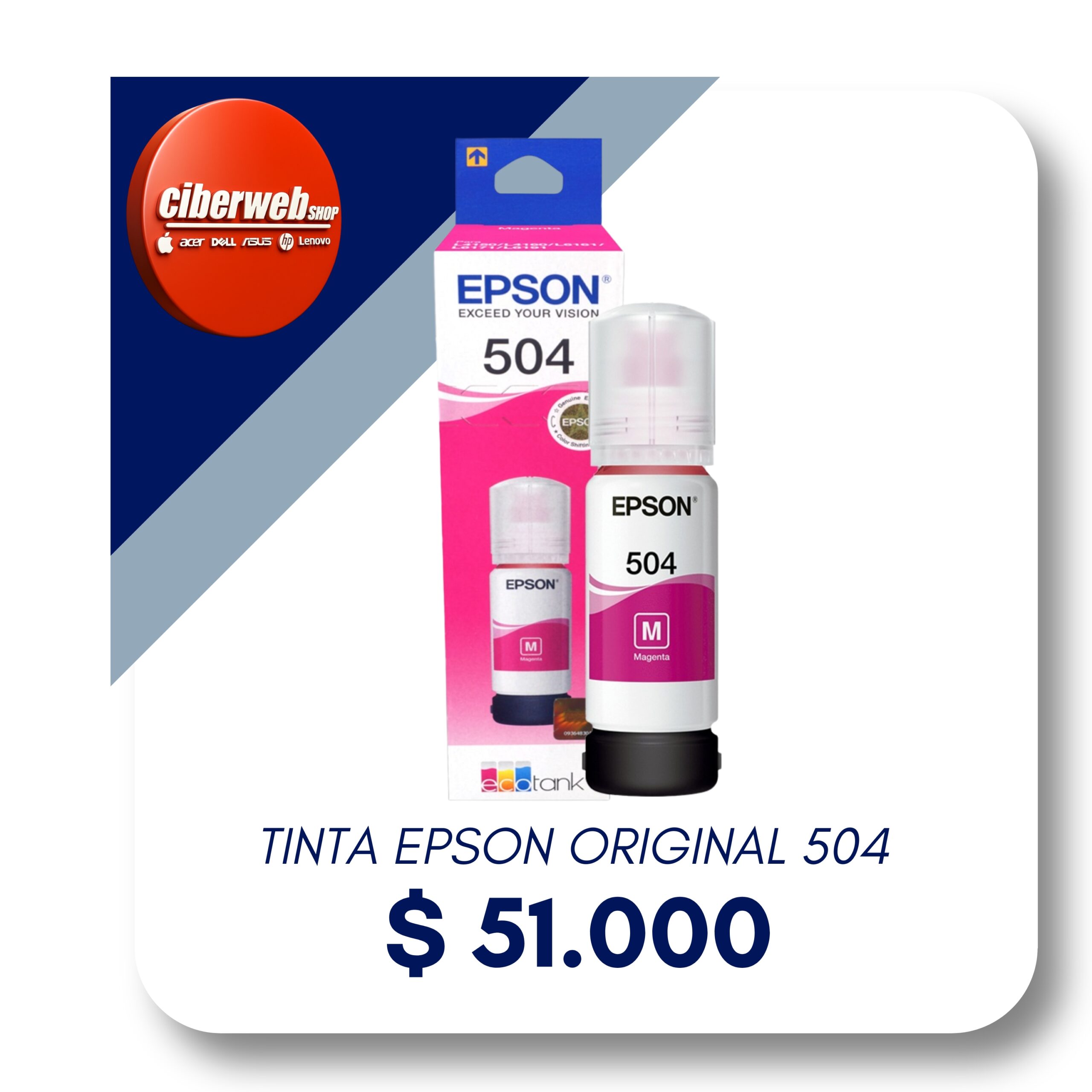 Botella de tinta Epson original. Rendimiento estimado de 6.000 páginas. Tamaño 70 ml Compatibilidad: EPSON L4150, EPSON L4160, EPSON L6161, EPSON L6171, EPSON L6191. Tecnología de impresión EcoTank. Color Magenta.